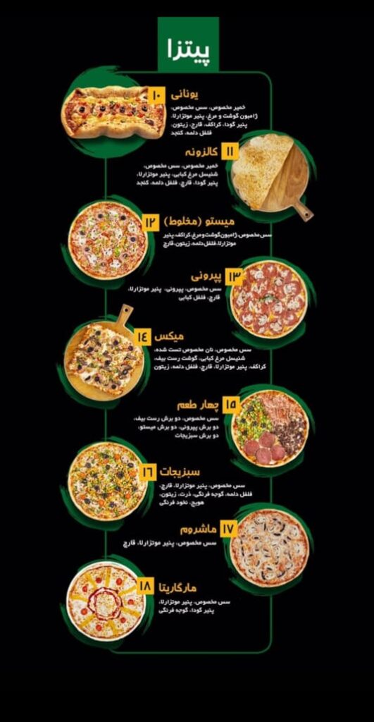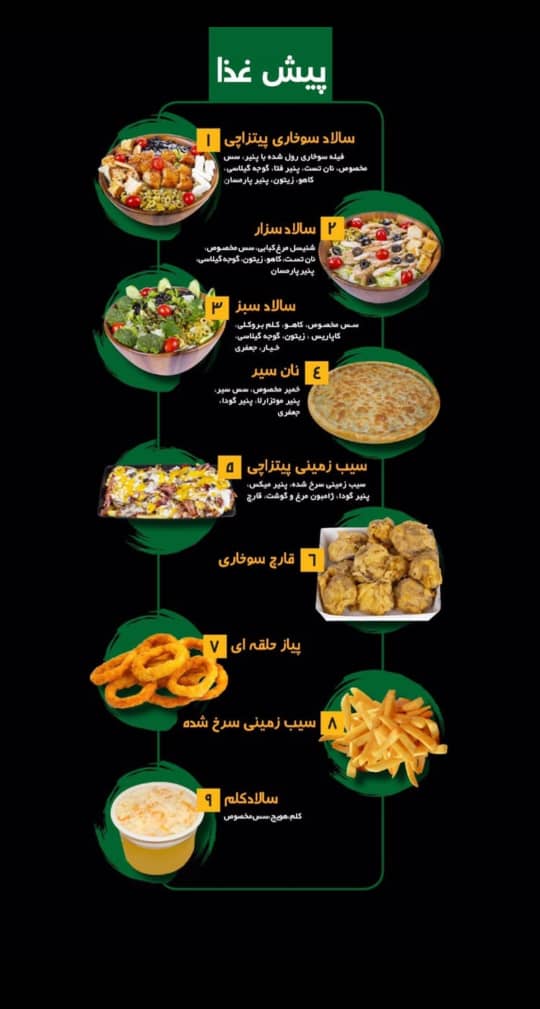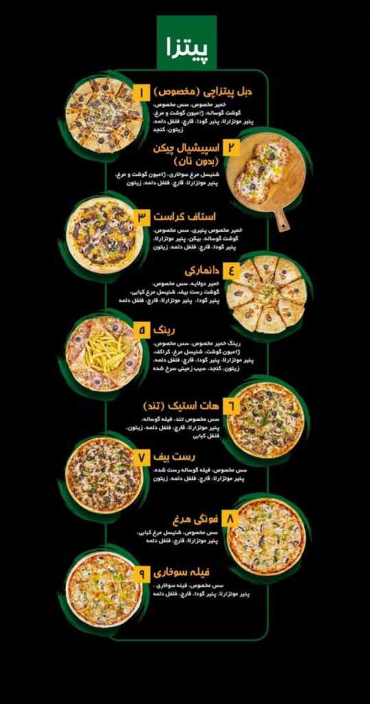 ارائه انواع پیتزا تخصصی ،برگر ،مرغ سوخاری ،ساندویچ ،انواع پیش غذا و نوشیدنی طبیعی به صورت حضوری با 50 نفر گنجایش سالن و تراس و بیرون بر و ارسال سراسر جزیره کیش